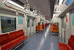 Formerly three carriage trains;[23] two trains have been coupled (may decouple in trough hours) to form a six carriage train.[24][25] Horizontal rows and reversible seats. |