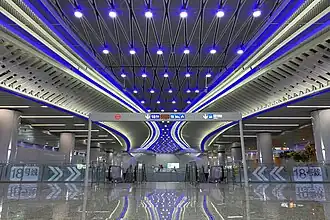 Line 18 of the Guangzhou Metro (Chinese: 广州地铁18号线; pinyin: Guǎngzhōu Dìtiě Shíbāhàoxiàn) is a rapid transit express line in Guangzhou with trains operating up to 160 km/h (99 mph).[5][6] It runs in a south-north direction, connecting Wanqingsha in Nansha District, Panyu Square in Panyu District, Modiesha in Haizhu District, Zhujiang New Town and Guangzhou East Railway Station in Tianhe District. The line commenced service on 28 September 2021.[1]