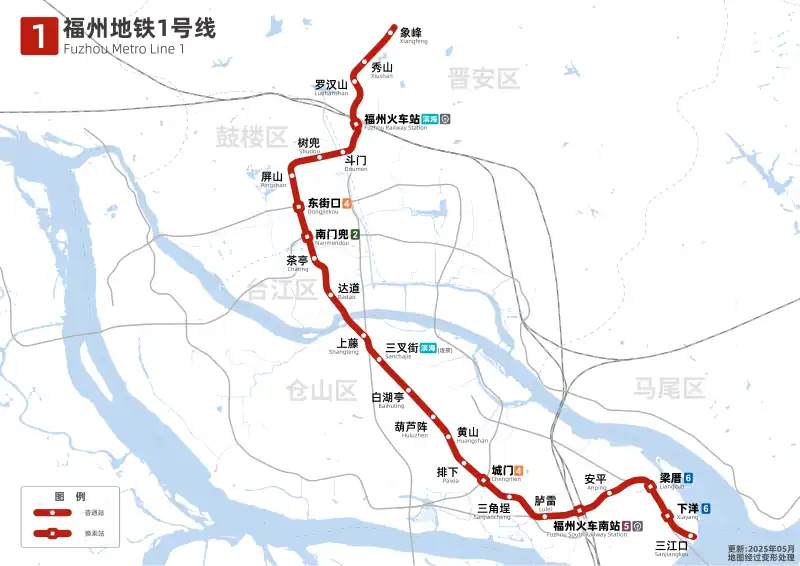 Line 1 is a metro rail line running from north to south in Fuzhou metropolitan area. It operates between Xiangfeng Station and Sanjiangkou Station, running through Fuzhou Railway Station, Dongjiekou Station, Nanmendou Station, Sanchajie Station, Chengmen Station, and Fuzhou South Railway Station, all of which are cities' major transportation junctions and proposed transfer stations with other subway lines.