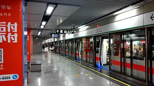Shenzhen Metro Line 1 (formerly branded as Luobao line) runs West–East from Airport East to Luohu.[3] Line 1 is shown as green on maps, however the band on both sides of the trains is coloured red. Traditionally, it is the most heavily used metro line on the Shenzhen Metro, serving an average of 960,000 people daily in 2014.[4] It has since been surpassed by Line 5, but still averages over 1 million passengers per day as of March 2021, despite this number being under COVID measures.[1]