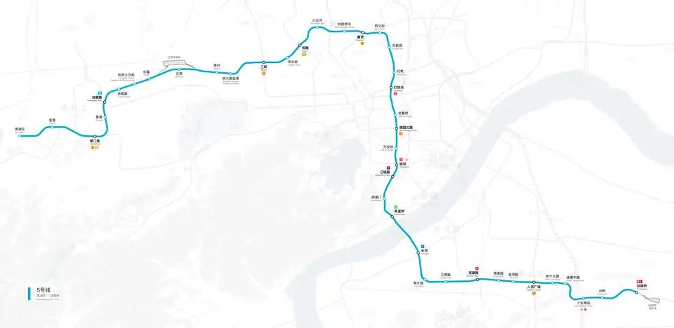 Line 5 runs from East Nanhu to Guniangqiao. The western terminus, Guniangqiao, is an interchange with Shaoxing Metro Line 1.