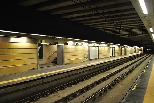 In the 2000s it was decided to complete the Mergellina station and to open the section that had already been built, but as a light metro without any connection with the tram network. The section was opened on 4 February 2007 from the Mostra to the Mergellina stations with two intermediate stations at Lala and Augusto and a frequency of a train every 8 minutes.[3][4]