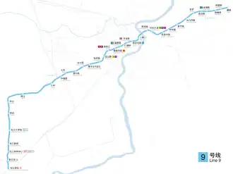 Line 9 is a southwest-northeast line of the Shanghai Metro network. The line runs from Shanghai Songjiang Railway Station in Songjiang District to Caolu in Pudong. The line is colored light blue on system maps.
