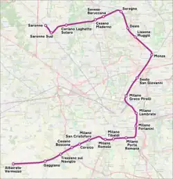 It uses the Saronno–Seregno, Milan–Chiasso, Milan belt, Milan southern belt and Mortara–Milan railway lines, and is operated by Trenord.