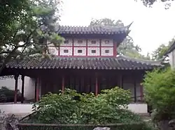 Named after a line by Zhu Shi (Song dynasty), "The water is imbued with green, forests have become more red...".[2] The name alludes to the numerous pines added to the garden during the second phase of construction. The typical farmhouse design typology, three bay with flat eves and full gables, of the villa reinforces the idea of a rustic retreat. |