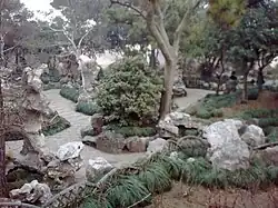 The 23,310 m2 garden is divided into four distinctly themed sections; East, Central, West, and North.[4] The Central area is the oldest part of the garden. Buildings, the primary feature of any Chinese garden, occupy one third of the total area. A unique feature of this garden is the 700m of covered walkway which connects them.[4] The built elements of the garden are grouped by section.[5] The ensemble of structures in the central garden encircles a pond and grotto main feature. The grotto is constructed of yellowstone granite and was created by the noted artist Zhou Binzhong. The eastern section of the garden is arrayed around the cloud-capped peak stone. A central courtyard is ringed by buildings. Behind the Old Hermit Scholars' House is the Small Court of Stone Forest, a collection of Scholar stones and connected minor courtyards. The western section is mostly natural, containing only a few pavilions, a large artificial hill, and a Penzai garden.