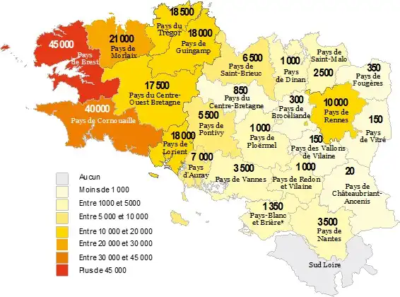 In area, Upper Brittany now takes in something over half of the 35,000 square kilometres of the whole of Brittany, but it has some 2.5 million people, compared with Lower Brittany's 1.6 million. In the early 20th century, about 60% of the population had lived in the Breton-speaking areas.[6]