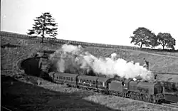 During 1857, the eastern bore was added to serve the goods line from Bletchley to Primrose Hill and support a rebuild of Leighton Buzzard station incorporating a dedicated platform for the Dunstable branch line. Elsewhere on the line, goods trains shared the "up" track through twin-track tunnels.[3] In 1876 a second freight line was added with twin-track tunnels except at Linslade, where a second single-track tunnel was added to the west of the original twin-track tunnel.[4] A new pair of passenger lines was added at the west of Leighton Buzzard station and the tracks through the twin-track tunnel were reallocated so that the passenger lines were served by the western single bore and the western track in the twin-track tunnel. This resulted in the unusual arrangement that, through the tunnel, trains "drive on the right".