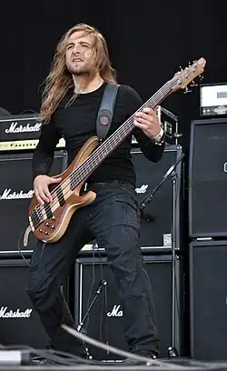At age 19, Klausenitzer attended the Music College in Regensburg, and afterwards made a degree at Hamburg Music and Art University.[1] After finishing studies, he did a lot of session work in different genres, and in the meantime, was in a number of different German bands, Fall of Serenity being the most well-known one. He was also a member of Noneuclid, a German/Dutch progressive death metal band. He first joined Obscura as a touring bassist in 2011 and not shortly afterwards, Klausenitzer was announced as the band's new bassist.[2] With them, he has recorded two albums—2016's Akróasis and 2018's Diluvium.