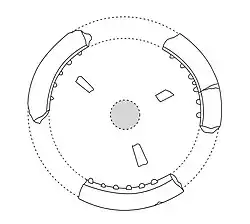 The lions supported a larger wheel,[22] also polished, symbolizing the dharmachakra, the Buddhist wheel of the "social order and the sacred law,"[38] which is lost except for fragments.[b][40] It was held in place by a shaft. According to the detailed[41] Catalogue of the Museum of Archaeology at Sarnath, 1914, written by Rai Bahadur Daya Ram Sahni the Director-General of the Archaeological Survey of India, 1931–1935, the stone shaft was not found but, "its thickness can be estimated from the mortice hole, 20 centimetres (8 in) in diameter, drilled into the stone between the lions' heads."[42] Further, according to Sahni, "Of the wheel itself, four small fragments were found. The ends of thirteen spokes remain on these pieces. Their total number was presumably thirty-two."[42] The original diameter of the surmounting wheel was conjectured to have been 0.84 metres (2+3⁄4 ft).[28] The wheel fragments are on display in the Sarnath Museum.[c]
