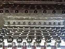 As small lion figurines are placed inside niches of the throne, it is called the Thihathana Throne or Royal Lion Throne. It is made out of yamane wood (Gmelina arborea). The upper portion of the throne is called "U-gin". There are eleven Chakra and Devas at the both sides of U-gin floral carvings. There are the peacock figurines, which represent the sun, and the hare figurine, which represents the moon, depicted on the proper left and right sides of the door jambs.