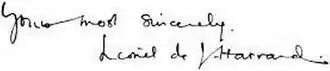 At the outbreak of the war, Lionel's younger brother Kenneth O'Gorman Harvard (born 4 June 1897)[2] gave up his intention to attend Harvard College.[14] He was commissioned August 1915[36] and, with Lionel, was promoted to lieutenant in the Grenadier Guards in January 1916.[14][29] He was killed at Pilckem Ridge, during the Battle of Passchendaele, on 1 August 1917;[1] Lionel, who had been fighting nearby, helped bury him.[5]