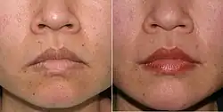 Another variation of the procedure is for a surgeon to make an incision inside the mouth to loosen the mucosa and vermilion, which are then advanced and secured, leaving a portion of scar tissue inside the mouth which may take 2–4 months to heal.[3] Yet another technique uses a "W" incision inside the mouth to create several "V" flaps, which are then used in a V-to-Y plasty technique to advance the vermilion of either or both lips.[3] This procedure leaves no exposed areas inside the mouth, but can be painful and has a lengthy recovery period.[5]