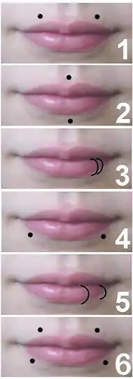 Lip piercings can be placed anywhere around the mouth, but the surface of the lip is not typically pierced itself, except for horizontal lip piercings and canine bites. Piercings in specific positions have certain names. Monroe piercings, for example, are labret studs worn on the upper lip where Marilyn Monroe had her famous beauty mark. Medusa piercings go through the center of the upper lip (the philtrum), perpendicular to the tissue. Labret piercings are pierced with a labret stud and can pierced in the center or off-center. A variation of this is the lowbret, a lower labret. Vertical labret piercings go through the center of the bottom lip, parallel to the tissue. The variation is called the vertical lowbret, which starts inside the mouth between the lower lip and the teeth and travels straight down, exiting on the lower edge of the jawline. Horizontal lip piercings are very rare, and include a horizontal bar on the lower lip that goes through the lip surface. Another variation of the labret is known as the dahlia piercing. The piercings, placed at or very near the corners of the mouth, are named in reference to the murder of Black Dahlia, in which the victim's mouth was cut along the same horizontal line along which these piercings are placed. (See Glasgow smile.)