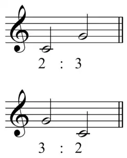 The reason for the effect of finality of such interval ratios may be seen as follows. If is the interval ratio in consideration, where is a positive integer and is the higher harmonic number of the ratio, then its interval in semitones can be determined by taking the base-2 logarithm . For example, a ratio of 3:2 gives , about seven semitones, and a ratio of 4:3 gives , about five semitones. The difference of these terms is the harmonic series representation of the interval in question (using harmonic numbers), whose bottom note is a transposition of the tonic by n octaves. This suggests why descending interval ratios with denominator a power of two are final. A similar situation is seen if the term in the numerator is a power of two.[3][4]