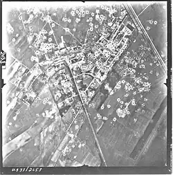 The city of Lippstadt was a major rail transportation hub for the Deutsche Reichsbahn (DRB), and the railroad marshaling yards were targeted by Eighth Air Force bombers on several missions beginning in late 1943.[2] The airfield was attacked twice throughout 1944: on 19 April 122 bombers dropped 840 500-lb general-purpose bombs and 1547 100-lb incendiary bombs. Later on 5 October 120 B-25 Mitchells from the 14th und 20th Combat Bombardment Wing, VIII Bomber Command - Eight Air Force, assisted by 107 P-51 Mustangs of the 355th and 361th, as well as 51 P-47 Thunderbolts of the 356th Fighter Group attacked the airfield and dropped 318 tons of general-purpose bombs and 176 tons of incendiary bombs. Several squadrons (56 bombers) of other wings with a target in Paderborn dropped by mistake their load also at the airfield.[3] The Luftwaffe also moved several Anti Aircraft (FlaK) units into the area for defense. As Allied ground forces moved into Eastern France fighter bombers made attacks on the airfields of the Luftwaffe in general. These tactical aircraft used 500-pound General-Purpose bombs, unguided rockets and .50 caliber machine gun sweeps to keep the interceptors pinned down on the ground and deny the use of the airfields to the Luftwaffe as ground forces advanced into Germany.[4]