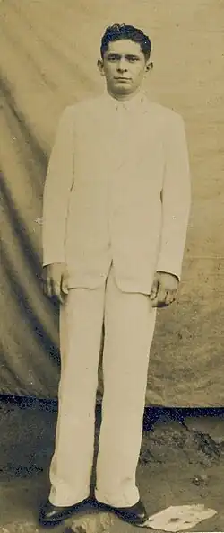 It is traditionally white, beige, cream or ecru, although it is available in other colors. Recently, liqui liquis have been worn by famous personalities in Venezuela for their weddings, in a renaissance of traditional dress – for example, Venezuelan folk musician Simón Díaz was known to almost always wear one.[1] The liqui liqui is traditionally made of linen or cotton cloth, although gabardine and wool can be used. The outfit is made up of a pair of full-length trousers and a jacket. The jacket has long sleeves and a rounded Nehru-style collar, which is fastened and decorated by a junta (chain link similar to a cufflink), which joins the two ends of the collar. The jacket is fastened by five or six buttons, and may or may not have pockets (if so, no more than four). Overall, the outfit is very simple with clean, elegant lines. Traditionally, the liqui liqui is worn with alpargata – an open-toed sandal – and a llanero hat.