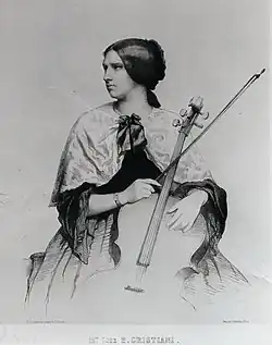 Cristiani was one of the earliest professional female musical performers of her era[3] and began playing numerous concerts in her late teenage years. The early tours she conducted included stops at Vienna, Linz, Ratisbon, Baden-Baden, and Hamburg. The last in Hamburg resulted in such a popular fervor for her that her portrait (shown above) became a highly sought after item.[2] Her level of play caught the attention of and the support of composer Felix Mendelssohn in 1845 during a concert in Leipzig. A piece for the cello in Mendelssohn's series Songs Without Words was dedicated to her the same year, though would not be publicly revealed until a posthumous publication after Mendelssohn's death.[4]