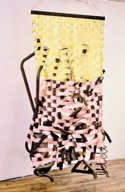 The sculpture Manifold Destiny (1991) was a notable example—a hanging assemblage of yellow and pink plastic patio furniture stripping increasingly entangled in rusted car mufflers and snaking exhaust pipes that suggested entropy.[11] Tema Celeste described it as a funny and frightening "Medusa in curlers … at once vulnerable and threatening, delicate and Herculean."[8] In shows at the Corcoran Gallery of Art (1992), Horodner Romley (1993, 1994) and Serpentine Gallery (London, 1998), domestic materials—thread, buttons, zippers, totems of colorful, stiff shirt sleeves, and shower curtains—predominated in works that employed an abstract sensibility and more airy, intuitive forms of weaving.[40][10][41][7][42] Heirloom (1994) consisted of skeins of colored thread that were tossed, fixed and installed in vertical fans of dense, lacy patterning across two corner walls, then connected by single threads to cast wax detergent bottle and household forms on the floor.[7] Critics likened the 12-foot work's appearance to "a grandmother's unraveled afghan,"[41] sea corals or tangled hair and its calligraphic patterns and process to Abstract Expressionism, a debt referenced in the double meaning of its title.[7][10][43][39]