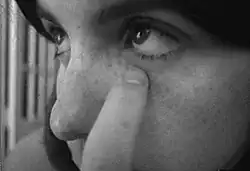 Steele's best known early work Birthday Suit – with scars and defects (1974) is a thirteen-minute black and white video tape where she "presents her naked body to the unblinking gaze of the camera". The tape itself is characterized by common practices of early video art, unedited with a static shot.[4] Steele turns the camera on, walks to the end of the room/set and removes her clothing. She approaches the camera and begins to examine the various scars she's accumulated over her life up to that point. The work represents what critic Dot Tuer indicates is "an offering to the technological gaze [which] downplays the representation of the body as a gendered subject,"[5] and as film historian Catherine Russell points out, the work is a "counter-image to the emergent critique of the female body in narrative cinema."[4] Steele's description of the work: