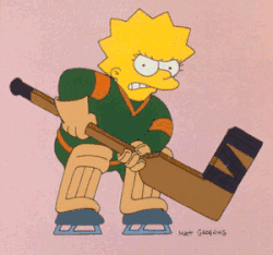 Later, the family watches Bart play hockey for his team, the Mighty Pigs, coached by Chief Wiggum. After the game, Bart ridicules Lisa for her lack of athletic skill and uses his hockey stick to pelt her with litter. Apu, the coach of the Kwik-E-Mart Gougers, witnesses Lisa deflecting the litter and throws a hockey puck at her without warning, which she catches. Apu makes Lisa the Gougers' goalie. Lisa excels as goalie and leads the team to its best season ever.