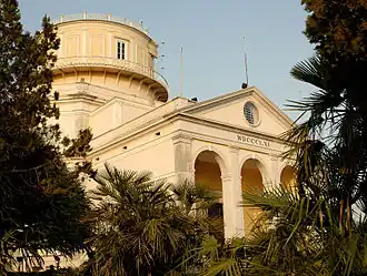 The plan of the building, executed by the French architect architects Jean François Gille Colson (1861-1865), José da Costa Sequeira (1800-1872) and Valentim José Correia (1822-1900) (then the most distinguished foreign architect living in Lisbon), was inspired by the building of the Russian Observatory in Pulkova.[1] Wilhelm Struve, then-director at Pulkova offered his services to the Portuguese government and became the main adviser, playing a very important role in the choice of equipment and the orientation of astronomer Frederico Augusto Oom (1830-1890), who was given a rough 5-year training session. Oom, was as a Navy Lieutenant and hydrographic engineer, who eventually became the first director of the Royal Astronomical Observatory of Lisbon and who ultimately had a very important role in the whole foundation of this building.[1]