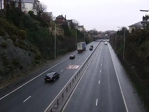 ![]() The site of the former Liscard & Poulton railway station, now the approach road from the M53 mid Wirral motorway into the Wallasey Tunnel. | |||||