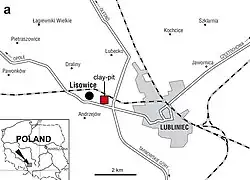 Remains of Lisowicia have been discovered in the Lipie Śląskie clay pit in Lisowice, a village in southern Poland near the town of Lubliniec, Silesia. The fossil bearing beds of Lipie Śląskie consist mostly of green mudstones. The age of the Lipie Śląskie clay pit has been difficult to determine, with different biostratigraphic methods of dating providing varying results. The site has typically been dated to the Rhaetian, which would make Lisowicia one of the youngest dicynodonts in the world. However, palaeontologists Grzegorz Racki and Spencer Lucas have claimed the site to be older and dated to the middle Norian stage based on biostratigraphy of large vertebrates, including Lisowicia. They instead suggested Lisowicia was not significantly younger than other dicynodonts and was similar in age to the last known genera elsewhere in the world.[8]