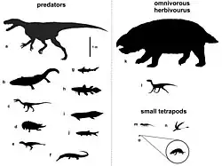 Lisowicia coexisted with a broad variety of Late Triassic animals in Lipie Śląskie. The majority of these animals were archosaurs, including the large predatory archosaur Smok, small dinosauromorphs including a silesaurid and a Coelophysis-like neotheropod, pterosaurs, and a small crocodylomorph (previously believed to be a poposauroid). Other small reptiles include a sphenodont, an indeterminate archosauromorph and a possible choristodere. The only other synapsid known to coexist with Lisowicia was Hallautherium, a small morganucodont mammaliaform closely related to modern mammals and many orders of magnitude smaller than Lisowicia. The wet, freshwater environment supported temnospondyl amphibians (a capitosaur and smaller plagiosaurid) as well as an abundance of fish including lungfish, coelacanths and hybodontid sharks.[8][16]