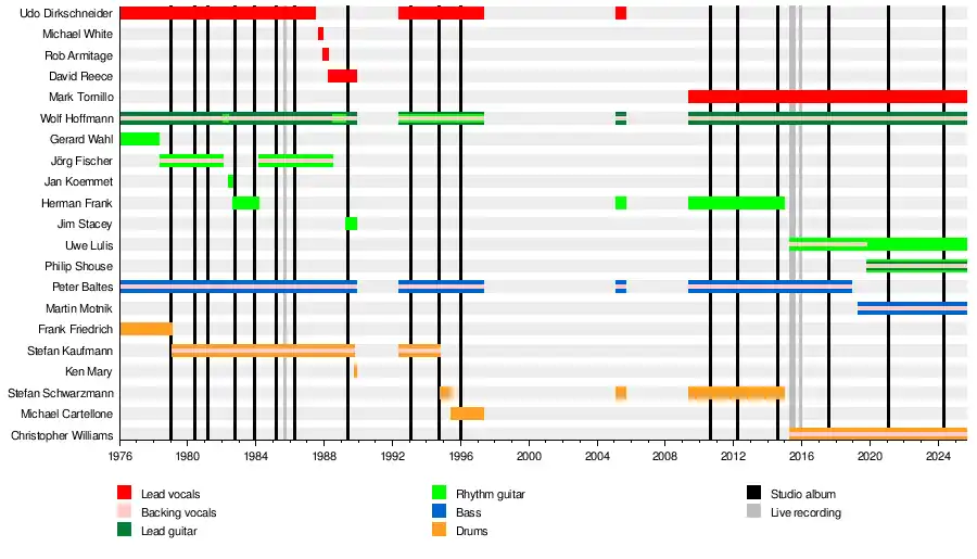 | Mark Tornillo | 2009–present | lead vocals | all Accept releases from Blood of the Nations (2010) onwards | |