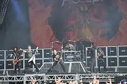 After the Death Row touring cycle, Schwarzmann was replaced by Michael Cartellone, who performed on 1996's Predator.[12] The group disbanded for a second time in 1997.[3] In 2005, Accept returned for a short run of shows in Europe and Japan, with Dirkschneider, Hoffmann and Baltes joined by Frank and Schwarzmann.[13] The tour ended in August, after which Hoffmann claimed that Dirkschneider was preventing a longer reunion for the band.[14] Members returned to other projects until 2009, when a new lineup of Accept was unveiled with vocalist Mark Tornillo in place of Dirkschneider.[15] The group's lineup remained stable until 2014, when Frank and Schwarzmann were fired.[16] Their places were taken in April 2015 by Uwe Lulis and Christopher Williams, respectively.[17] Baltes quit the band in November 2018.[18]