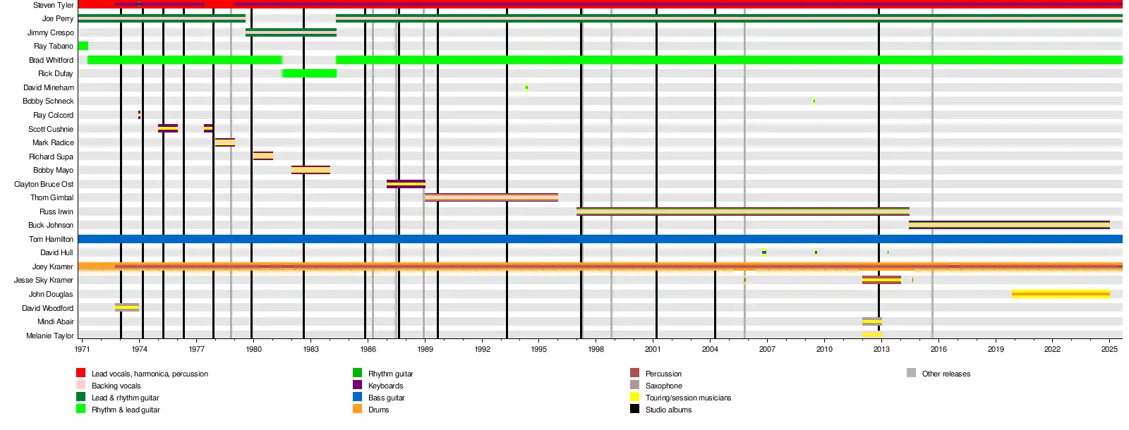 Aerosmith is an American hard rock band from Boston, Massachusetts. Formed in October 1970, the group originally included vocalist Steven Tyler, lead guitarist Joe Perry, rhythm guitarist Ray Tabano, bassist Tom Hamilton and drummer Joey Kramer, although Tabano was replaced by Brad Whitford early the following year.[1] The band's lineup has remained constant for much of its tenure, save for a five-year period between 1979 and 1984. First, Perry left the band after a show on July 28, 1979, when a confrontation between his then-wife Elyssa and Hamilton's wife Terry led to an argument between the guitarist and Tyler, resulting in the former's departure.[2] After contributing to Night in the Ruts as a session guitarist, Jimmy Crespo was invited to replace Perry in Aerosmith in October 1979.[3] Whitford also left Aerosmith in 1981 to work on a solo project with former Ted Nugent singer Derek St. Holmes.[4] He was replaced by Rick Dufay, before both Perry and Whitford returned to the band in the spring of 1984.[5]