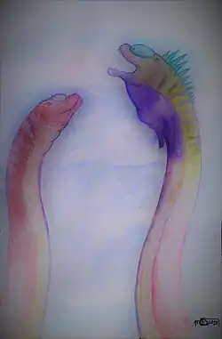 | Spinosaurus | 1915 | Bahariya Formation, Chenini Formation, Kem Kem Group (Late Cretaceous, Cenomanian) | Possessed a myriad of features that have been suggested to be evidence of a semiaquatic lifestyle, including webbed feet[39] and a paddle-like tail.[40] However, it is debated if it was a marine piscivore[41] or a shoreline generalist[42] |