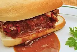 | French dip | Nationwide; origins in Los Angeles | Thinly sliced roast beef on a French roll or baguette, usually served au jus | |