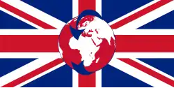 UK flag defaced with a globe and an arrow circumnavigate it from North to South.