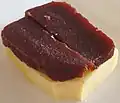 Quince | Dulce de membrillo is made of quince fruit, sugar and water, cooked over a slow fire. It is sweet and mildly tart, and similar in consistency, flavor and use to guava cheese or guava paste.[2] It is sold in squares or blocks, then cut into thin slices and spread over toasted bread or sandwiches, plain or with cheese, often served for breakfast or as a snack, with manchego cheese or mató cheese. It is very often used to stuff pastries. |