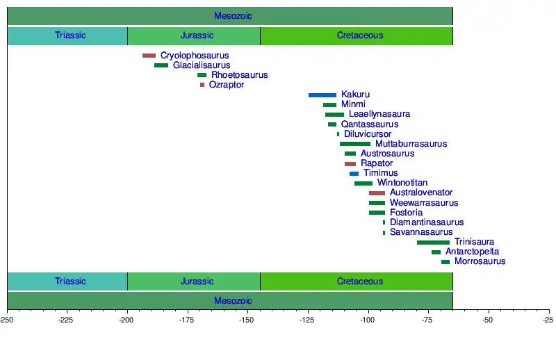 | Diamantinasaurus | 2009 | Winton Formation (Late Cretaceous, Cenomanian) | May have been closely related to South American titanosaurs, suggesting they dispersed to Australia via Antarctica[4] |