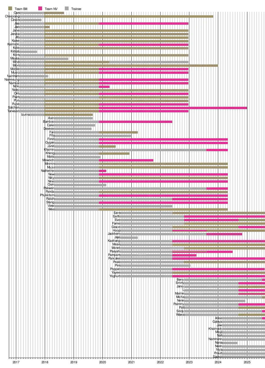 The original members of the group were recruited in mid-2016 and announced in early 2017, comprising a total of 30 people. For the second generation, 27 additional members were announced on 29 April 2018.[1] On 9 August 2020, 19 third-generation members were announced,[2] and on 30 October 2022, 11 fourth-generation members were revealed.[3] Some members have left the group in a process known as graduation. As of August 2025, the group consists of 38 members, of whom 12 constitute Team BIII, 8 constitute Team NV, and the rest categorised as trainees.[4][5][6]