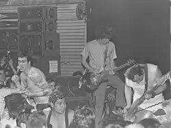 After Pettibon's exit from the group, a friend of Morris' known as "Kansas", real name Jim Dearmen, became their new bassist.[91] Described by Morris as "just this huge stoner", Kansas and drummer Bryan Migdol were not committed to the band and would often fail to show up for rehearsals.[3] This caused Ginn to modify his guitar style to a percussive strum that doubled as a lead and rhythm section.[4] Kansas left the band before the summer of 1977, and was replaced at rehearsals by Glenn "Spot" Lockett.[92]