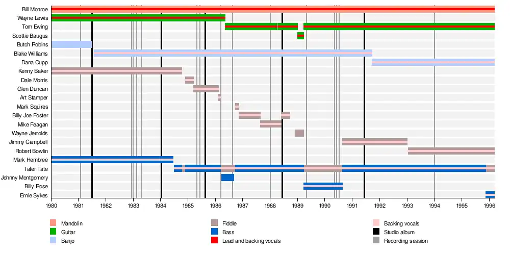 Later in November, Dale Morris joined as Kenny Baker's replacement on fiddle, with Tate switching back to bass.[218] Morris remained only until mid-March, leaving begrudgingly due to lack of income, with Glen Duncan taking his place.[219] During May and June, the band recorded the album Bill Monroe and Stars of the Bluegrass Hall of Fame with a range of guests, including former BGB members Sonny Osborne, Carl Story, Mac Wiseman and Del McCoury.[220] After a string of robberies and instances of criminal damage aimed at Monroe later in the year, Lewis briefly stepped back from the band in mid-January, arranging for Joe Stuart to cover a couple of shows.[221] By mid-February, Duncan had left to work with other artists, with Art Stamper taking his place.[221] His tenure lasted only four weeks, however, and by mid-March he had left again.[222] Tate switched to fiddle for a few shows, before Buddy Spicher was enlisted for four recording sessions on March 17 and 18.[222]