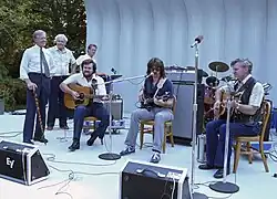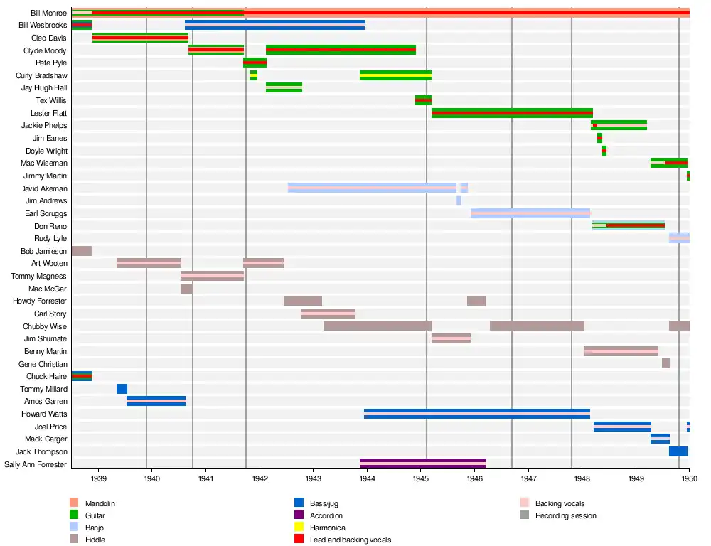 The Blue Grass Boys were the backing band for bluegrass mandolinist Bill Monroe. Active from 1938 until Monroe's death in 1996, the group are cited as one of the earliest and most influential groups of the bluegrass genre, which takes its name from the band's moniker.[1] Over its 58-year tenure, the Blue Grass Boys included over 150 members, as well as numerous additional stand-in and guest musicians, many of whom have since been inducted into the International Bluegrass Music Hall of Fame and/or Country Music Hall of Fame. At the time of their first recording in 1939, the group's lineup featured guitarist Cleo Davis, fiddler Art Wooten and bassist Walter "Amos" Garren;[2] at the time of their first release in 1940, Monroe was backed by guitarist Clyde Moody, fiddler Tommy Magness and bassist Bill "Cousin Wilbur" Wesbrooks.[3] The final lineup of the band featured guitarist Tom Ewing, banjoist Dana Cupp, fiddlers Robert Bowlin and Clarence "Tater" Tate, and bassist Ernie Sykes.[4] Monroe died on September 9, 1996, at the age of 84.[5]
