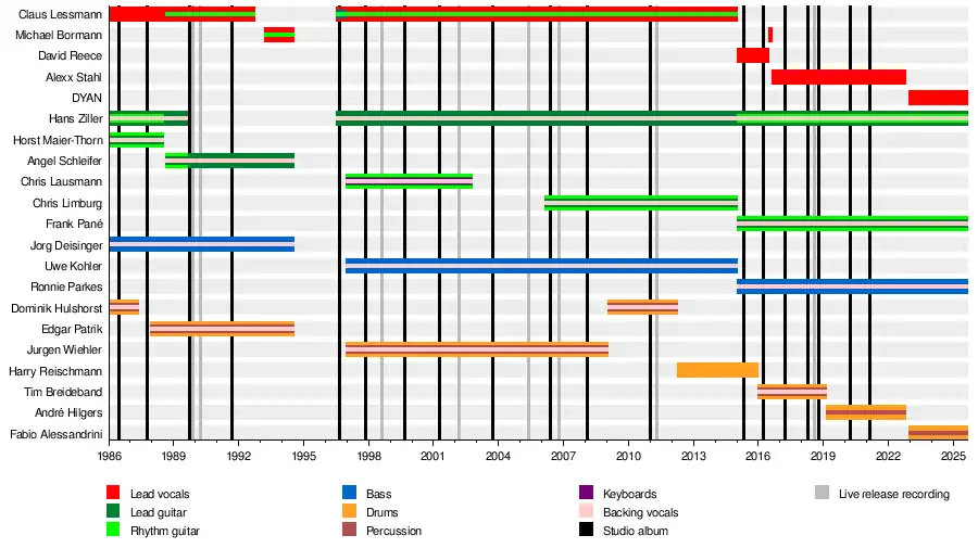 After not releasing a new album since 2011, Bonfire announced at the beginning of 2015 that Lessmann, Limburg and Köhler had all left the band, replaced by David Reece (formerly of Accept), Frank Pané and Ronnie Parkes, respectively.[18][19] The new lineup issued Glörious in April, before Reischmann was replaced by Tim Briedeband in December.[20] Pearls followed in March 2016, before Reece left that July due to "irreconcilable personal and professional differences".[21] The band's former vocalist Michael Bormann was originally slated to join as Reece's replacement, however he was unable to join until mid-October which led the group to bring in Alexx Stahl as a temporary stand-in for a short run of shows. Due to his performances, he was upgraded to an official member, instead of Bormann.[22]