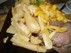 Fried cassava (mandioca, aipim, or macaxeira) is a typical substitute for French fries in Brazil. It is commonly served in bars along with beer. |