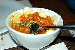 Made from okra, onion, shrimp, palm oil and toasted nuts (peanuts and/or cashews). It is a typical condiment in the northeastern state of Bahia |