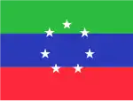 A light blue field with a large white five-pointed star surrounded by a circle of eight small white five-pointed stars, with three horizontal stripes of yellow, green and red in the hoist