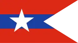 A horizontal triband of blue, red and blue; charged with a large white five-pointed star at the centre