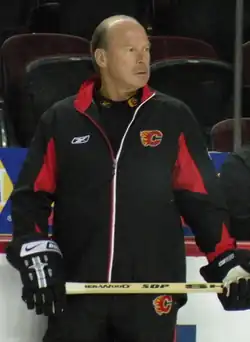 The Flames went through several coaches between 1990 and 2003 as the team struggled to find playoff success. Doug Risebrough, Dave King, Pierre Page, Brian Sutter, Don Hay and Greg Gilbert all failed to lead the team past the first round as the Flames endured a 15-year period of playoff futility.[5] Darryl Sutter ended that streak in 2003–04 when he coached the Flames to a marked improvement over their previous season, ending with a trip to the 2004 Stanley Cup Finals. Though he did not win, Sutter earned a nomination for the Jack Adams Award as the league's top coach as a result of the team's performance.[6] Bob Hartley became the head coach in 2012 and won the 2015 Jack Adams Award. He was fired after the 2015-16 season.[7] The current head coach of the Flames is Ryan Huska.[8]