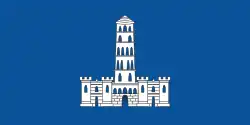 pre-1945 | Variant flag of Split, featuring the device from the pre-1945 coat of arms. | A blue flag with a white-color illustration of the walls of Diocletian's Palace and the bell tower of Saint Domnius Cathedral behind them. |