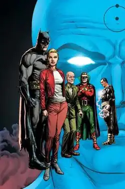 - Doctor Manhattan / Jonathan Osterman — A former member of the Crimebusters who remains skeptical of humanity's hope. He is suspected for altering the DC Universe following the Flashpoint event, and for making "experiments" in the lives of Superman and everyone else. When he was summoned by Ozymandias through Bubastis II, Manhattan reveals about Ozymandias's false cancer, and why he spared the Mime and Marionette's firstborn child.[IV] After Firestorm's incident, Manhattan was confronted by most of Earth's heroes, but he defeated them all.[VI][VII] Before arriving on Earth to confront Superman, Manhattan spares the defeated heroes on Mars, but makes sure they don't interfere.[VIII] After Superman stops Pozhar from attacking him, Manhattan meets with Superman, who convinces him to restore the timeline.[V]