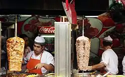 Gyros are a Greek dish of meat cooked on a vertical rotisserie.